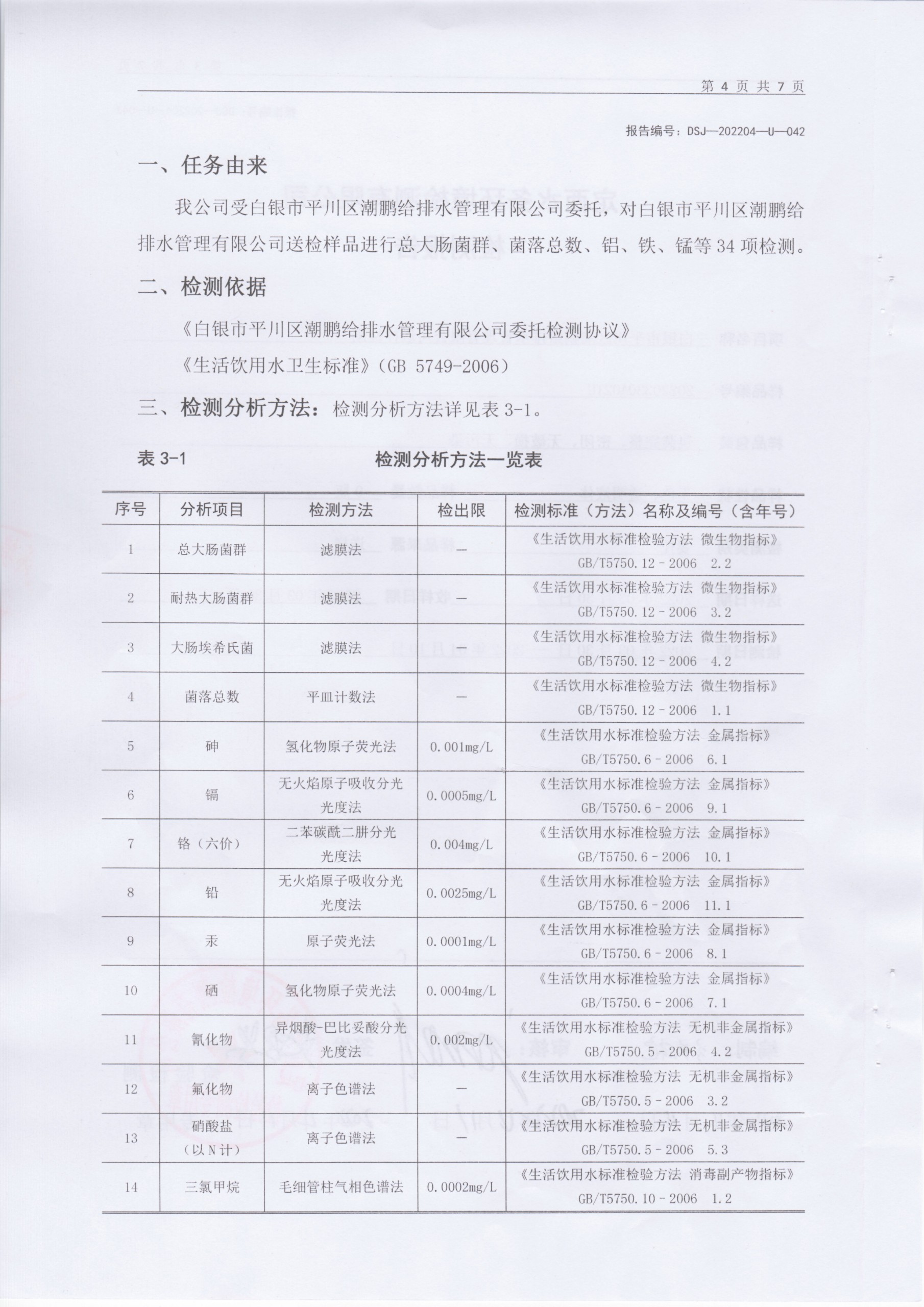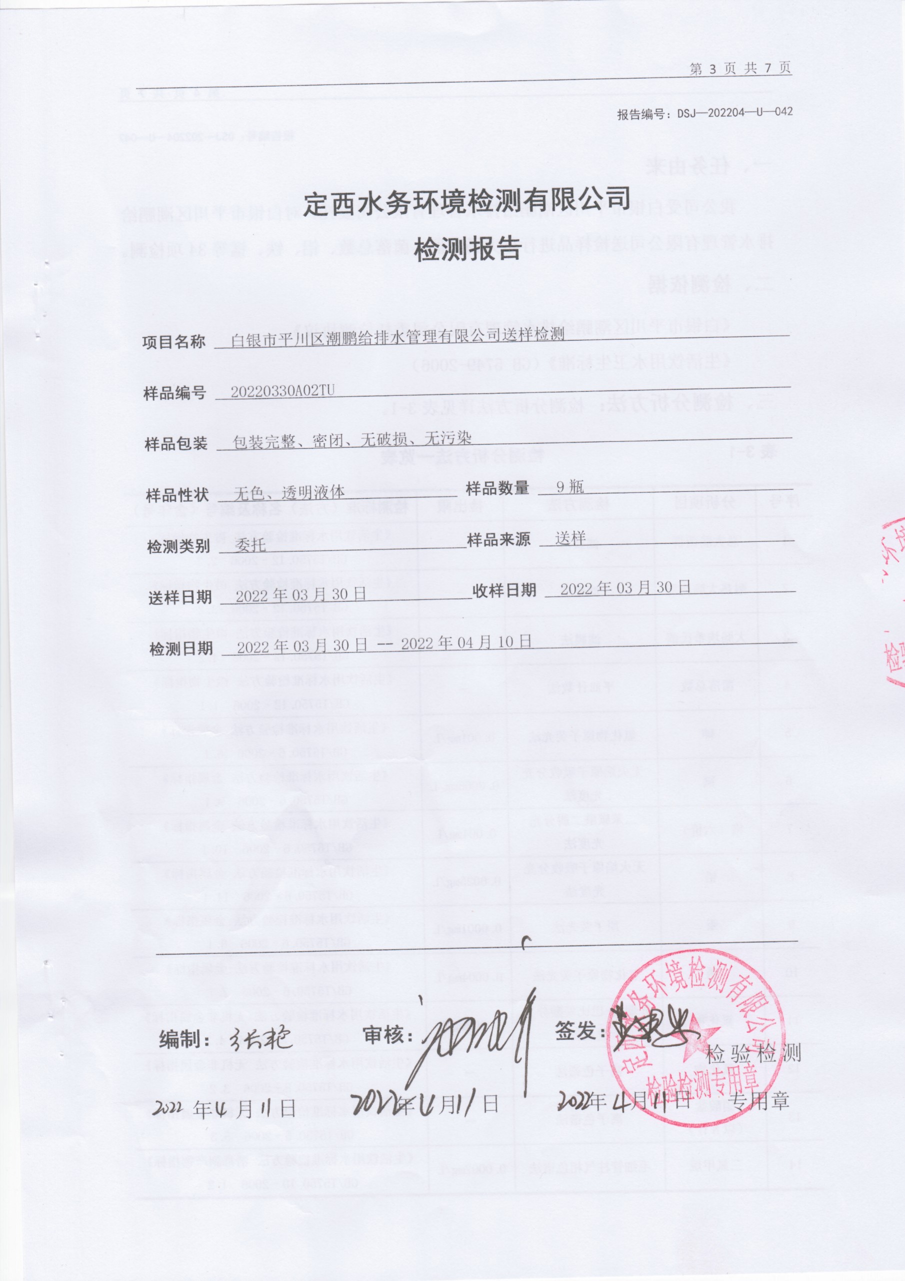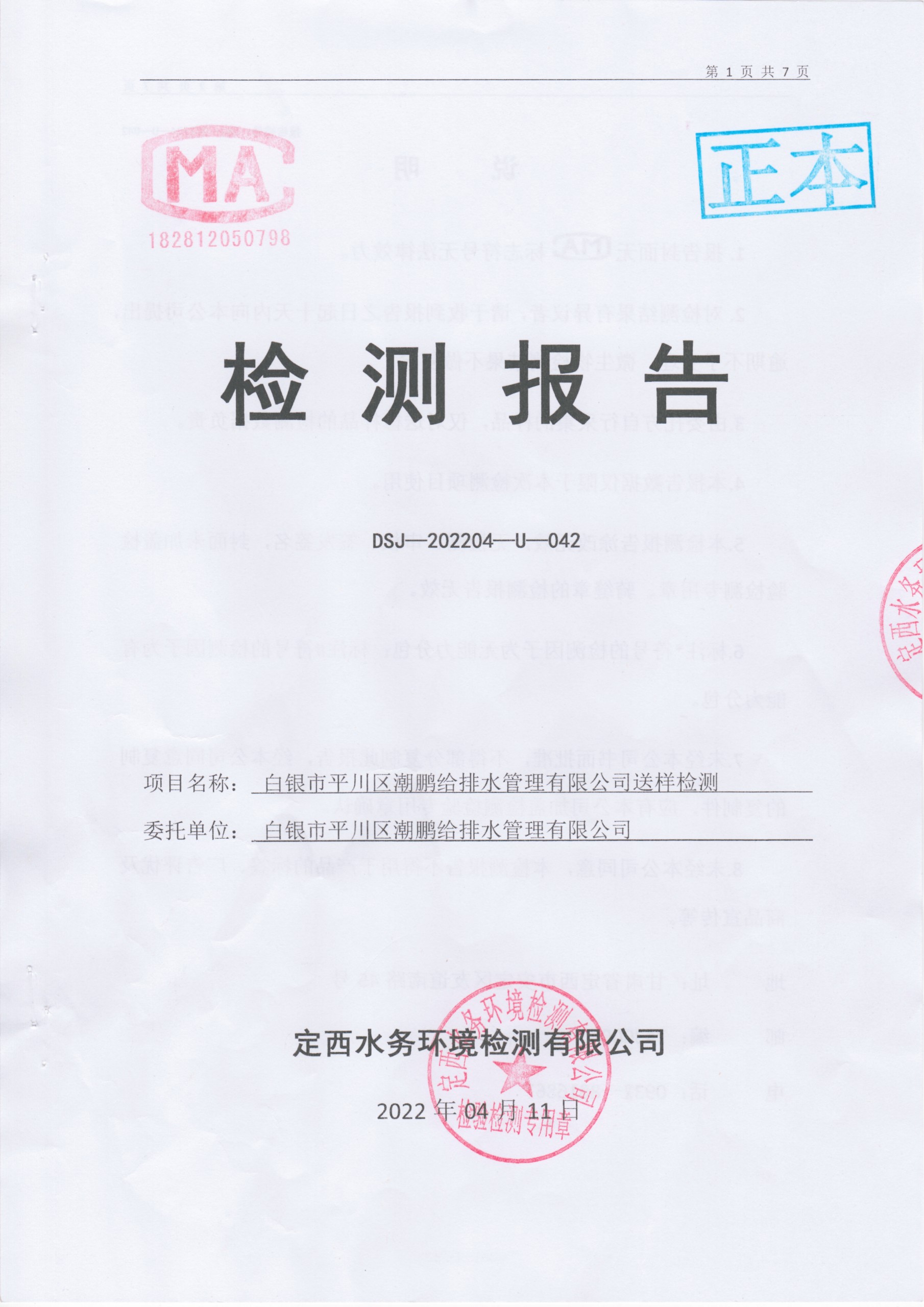 平川区潮鹏给排水管理有限公司2022年第一季度水质检测报告