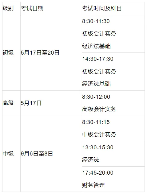 1.初级会计资格考试于2025年5月17日至20日举行,共8个批次。《初级会计实务》科目考试时长为105分钟,《经济法基础》科目考试时长为75分钟,两个科目连续考试,时间不能混用。 2.高级会计资格考试《高级会计实务》科目考试时间为2025年5月17日8:30-12:00,考试时长为210分钟。 3.中级会计资格考试于2025年9月6日至8日举行,共3个批次。《中级会计实务》科目考试时长为165分钟,《经济法》科目考试时长为120分钟,《财务管理》科目考试时长为135分钟。 会计资格考试时间、批次如有调整,将另行通知。 (二)报名时间 1.初级会计资格:2025年1月3日开始1月24日12:00截止;网上缴费时间:2025年1月3日开始1月24日18:00截止。 2.高级会计资格:2025年1月3日开始1月23日24:00截止;网上审核时间:2025年1月3日开始1月24日12:00截止,逾期不予审核;网上缴费时间:2025年1月3日开始1月24日18:00截止。 3.中级会计资格:2025年6月12日开始7月2日12:00截止;网上缴费时间:2025年6月12日开始7月2日18:00截止。 报考人员请按照报名条件和有关要求,慎重报名和缴费,缴费确认后,不办理退考退费。 (三)准考证打印时间 1.初级和高级资格:2025年5月1日至5月20日。 2.中级资格:2025年8月22日至9月8日。 报考人员登录“全国会计人员统一服务管理平台”打印准考证。 (四)成绩公布时间 1.初级资格:2025年6月28日前。 2.高级资格:2025年7月5日前。 3.中级资格:2025年11月1日前。 报考人员登录“全国会计人员统一服务管理平台”查询成绩。 四、报名程序及审核方式 (一)初级会计资格报名条件审核采取考后审核确认方式 1.符合报名条件报考初级会计资格的人员,登录“全国会计人员统一服务管理平台”(https://ausm.mof.gov.cn)点击右上角“注册”按钮,完成注册(已在平台注册的无需重复注册)。点击“会计人员登录”,无需进行“会计人员信息采集”,直接选择“会计专业技术资格考试”模块,进入网上报名,点击初级入口,选择报考省、市州报名点、报考条件,填写报考信息,进行网上缴费,缴费成功即可完成报名。 2.已通过考试且成绩合格的人员,经考后审核确认后,方可取得初级会计资格证书。 (二)高级会计资格考试报名条件审核采取网上审核方式 1.符合报名条件报考高级会计资格的人员,登录“全国会计人员统一服务管理平台”(https://ausm.mof.gov.cn)点击右上角“注册”按钮,完成注册(已在平台注册的无需重复注册)。点击“会计人员登录”,选择“会计专业技术资格考试”模块,进入网上报名,点击高级入口,选择报考省、市州报名点、报考条件,填写报考信息,上传学历证书、会计师资格证书和盖章后的信息表(经本人所在单位人事及上级主管单位人事部门审核盖章),文件大小不超过300KB。 2.参加高级会计资格考试的报考人员及时关注审核状态,审核通过后,自行网上缴费,缴费成功即可完成报名。 (三)中级会计资格考试报名条件审核采取考后现场审核方式 1.符合报名条件报考中级会计资格的人员,如果尚未完成“会计人员信息采集”,须先登录“全国会计人员统一服务管理平台”(https://ausm.mof.gov.cn)完成“会计人员信息采集”,信息采集审核通过后,选择“会计专业技术资格考试”模块,进入网上报名,点击中级入口,选择报考省、市州报名点、报考条件,填写相关信息,进行网上缴费,缴费成功即可完成报名。 2.考试成绩当年度全科合格或连续两个年度全部科目合格人员,于2025年11月15日前持学历或学位证书、居民身份证等原件,进行现场审核(具体时间、地点、要求等关注省、市州发布的审核通知)。报名条件审核未通过的考生考试成绩无效。 五、其他要求 申请报考人员应当对所提供材料的真实性负责,如提供虚假信息,其后果由本人自行承担。 六、咨询电话 平川区财政局会计股:0943-5912840