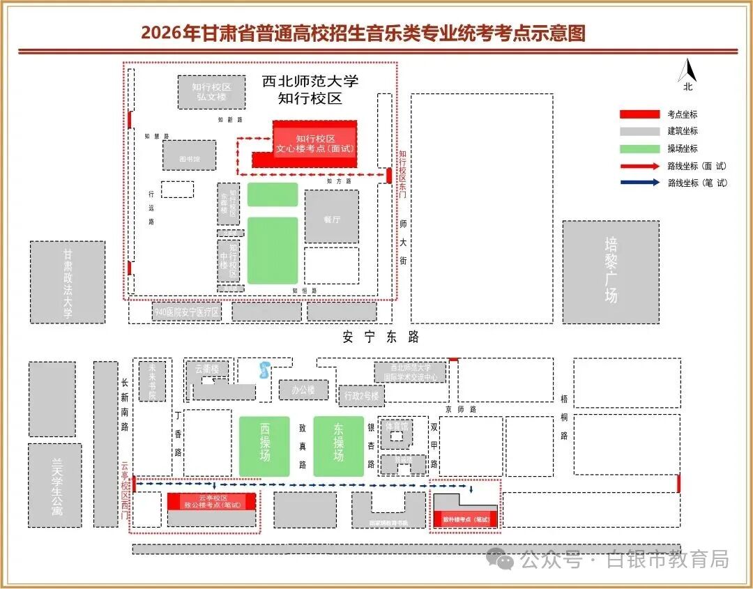 音乐类专业统考分音乐表演、音乐教育两类。音乐表演考试包括乐理、听写、视唱、器乐/声乐四个科目;音乐教育考试包括乐理、听写、视唱、主项(声乐、器乐各选其一)、副项(器乐、声乐各选其一)五个科目,主项选择声乐的考生,副项须选择器乐,主项选择器乐的考生,副项须选择声乐。音乐表演、音乐教育兼报考生,有重复考试科目的,仅参加一次考试,考后按《2026年甘肃省普通高等学校招生艺术类专业统一考试说明》向考生提供两个统考专业类别成绩。 考生于2026年1月5日8:00起登录甘肃省国家教育考试管理平台(https://kw.ganseea.cn)打印笔试《准考证》,笔试考试于2026年1月10日9:00进行。 考生于2026年1月7日8:00至1月8日18:00完成面试预约;2026年1月12日8:00起登录甘肃省国家教育考试管理平台(https://kw.ganseea.cn)打印面试《准考证》,面试考试自2026年1月17日8:00开始。 考生根据笔试、面试《准考证》公布信息按规定参加考试。 考试实行“考评分离”方式,仅报考音乐表演的考生在同一时段先后在声乐/器乐考场、视唱考场完成相应科目的考试;报考音乐教育的考生同一时段先后在声乐/器乐考场、视唱考场完成主项及视唱科目的考试,再根据时间安排完成器乐/声乐考场副项科目的考试。 所有面试环节考生均不得化妆(含睫毛、美甲等),不可着演出服。考生应统一着浅色衬衣、深色长裤,所着服装不得带学校或辅导机构标识、图案、名称。 考生检录完成后,按考试工作人员指引进入候考区域等候。 器乐/声乐作为主项科目考试备考时,考生点击考务平板“开始抽题”按钮抽取所上报器乐乐曲/声乐曲目1首,抽取结果由考试系统随机产生,试题产生后,考生不得要求更换。声乐曲目抽取完成后,考生在考务平板确认自己上传的第一乐句。 视唱科目考试备考时考生点击考务平板“开始抽题”按钮随机抽取视唱试题,并在备考区使用平板进行备考。试题由考试系统随机产生,试题产生后,考生不得要求更换,备考时间不超过1分钟。 考生依次进入器乐/声乐考场、视唱考场参加考试(报考音乐教育考生还需第二次到达考点参加副项科目考试)。考生进入考场后在指定区域就位,不得调整摄像机和话筒等设备,查看考场内显示屏显示的本人相关信息。根据系统语音提示,正对主摄像头完成所在考场科目的考试音视频录制。 1.主项(器乐/声乐)。考生抽取乐曲/曲目后进入器乐/声乐考场准备考试。考生准备就绪并口头示意,听到“考试开始”指令后,进行主项(器乐/声乐)科目考试。 主项为器乐的考生在考试时演奏练习曲1首、抽取的乐曲1首,总时长不超过8分钟,考试录制8分钟后自动停止,考试过程中不做任何提示,考生须自行安排好练习曲和乐曲的演奏时间。所有乐器不得使用任何伴奏(包括自动伴奏),要求背谱演奏。 主项为声乐的考生在考试时演唱抽取曲目1首,总时长不超过3分钟,考试录制3分钟后自动停止。考试前,系统会播放考生上传的第一乐句,以确定自己演唱歌曲的音高,上传音频无法播放的,将播放标准音a1。考试时要求清唱,不可使用伴奏。 2.视唱。考生进入视唱考场,所抽取的试题将展示在屏幕上,考生通过屏幕查看并完成考试。考生听到“考试开始”指令后进行视唱科目考试,考生一遍完成视唱,视唱过程中无任何音响提示,总时长不超过1分钟,考试录制1分钟后自动停止。考试开始前系统会提供标准音a1。 3.副项(声乐/器乐)。考试范围为仅报考音乐教育的考生。考生进入声乐/器乐考场准备考试,考生准备就绪并口头示意,听到“考试开始”指令后,进行副项(声乐/器乐)科目考试。 副项为声乐的考生演唱上报曲目,总时长不超过3分钟。考试录制3分钟后自动停止。 副项为器乐的考生演奏上报乐曲,总时长不超过4分钟。考试录制4分钟后自动停止。 各科目考试录制过程中,考生若提前结束考试,须举起“结束考试”的标牌示意方可提前结束。如考生中途放弃考试,仍须录制未完成科目音视频,考生须口头表达“我自愿放弃该科目考试”,并举起“结束考试”的标牌示意,结束当前科目考试。 考场有计时提醒,考生应注意把握考试时间。 考生所有科目音视频录制完成后,按系统语音指令确认回放音视频,确认无误后在考场外签字确认并迅速离场。考生确认回放音视频只涉及视频画面是否本人、录制是否完成,不涉及考试内容或状态等。 (一)考生须认真阅读《2026年甘肃省普通高等学校招生音乐类专业统一考试说明》和《考生指南》,详细了解考试安排、考试流程等,根据考试要求认真备考。冬季为呼吸道疾病多发季节,考生应做好健康防护,避免交叉传染。 (二)考生凭居民身份证、《准考证》按照规定的出入口及路线进出考点,务必提前合理规划出行时间和路线,预留足够时间配合考点工作人员进行入场核验和安检。 (三)考生进入考点时须通过智能安检门检测和人工安检,严禁携带各种通讯工具(手机、手环、智能眼镜及其他具有无线接收、传送功能的电子设备等)或具有存储、查询、录音及摄像功能的电子设备、手表、书籍、报刊、参考资料、节拍器、草稿纸等违规物品进入考点,如有携带,在进入考点前自行托管保存。考试过程中一经发现带入上述物品者,无论使用与否均按考试作弊处理。为顺利通过安检,考生不穿戴有金属装饰品的衣服、鞋帽等,不佩戴金属手镯、项链