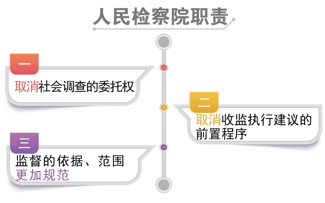 六 人民检察院职责 一是取消社会调查的委托权。根据《中华人民共和国社区矫正法》第18条的规定,只有社区矫正决定机关根据需要,才可以委托社区矫正机构进行调查评估。社区矫正决定机关是指依法判处管制、宣告缓刑、裁定假释、决定暂予监外执行的人民法院和依法批准暂予监外执行的监狱管理机关、公安机关。二是取消收监执行建议的前置程序。实践中,矫正机构提请收监执行的,得先征求检察院意见;《中华人民共和国社区矫正法》第46条规定:社区矫正机构向人民法院提出撤销缓刑、假释建议,将建议书抄送人民检察院。三是监督的依据、范围更加规范。检察院依照法律(非部门规章、文件通知等)规定的权限、程序和规范依法独立行使检察权。