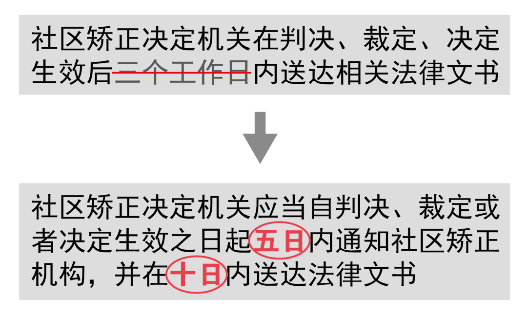 十 调整了部分工作时限 《社区矫正实施办法》第5条规定:社区矫正决定机关在判决、裁定、决定生效后三个工作日内送达相关法律文书;《中华人民共和国社区矫正法》第20条规定:社区矫正决定机关应当自判决、裁定或者决定生效之日起五日内通知社区矫正机构,并在十日内送达法律文书。