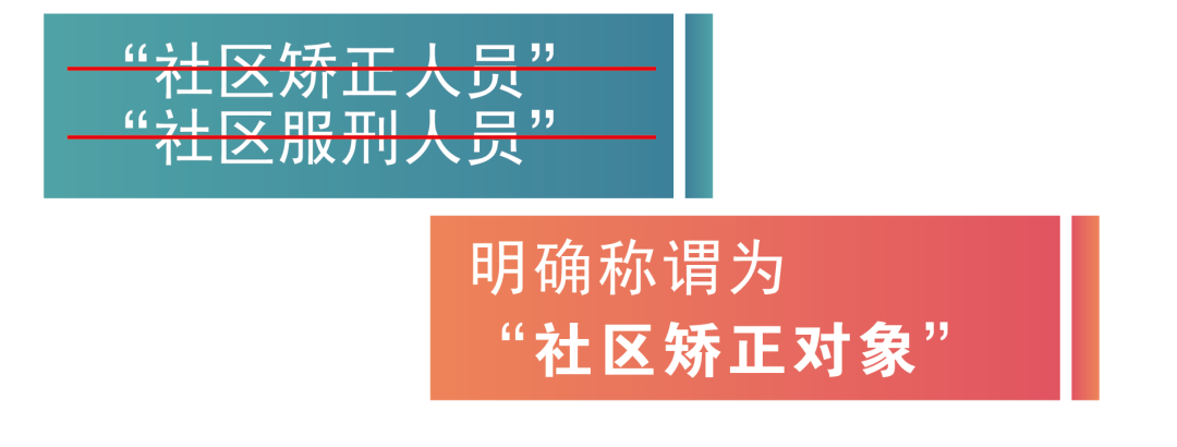 三 称谓 《社区矫正实施办法》称谓为“社区矫正人员”,在实践中又有称“社区服刑人员”的情况;《中华人民共和国社区矫正法》明确称谓为“社区矫正对象”。使用“社区矫正对象”称谓更人性化,防止标签化称谓(服刑人员),更符合促进社区矫正对象顺利融入社会的目的任务。