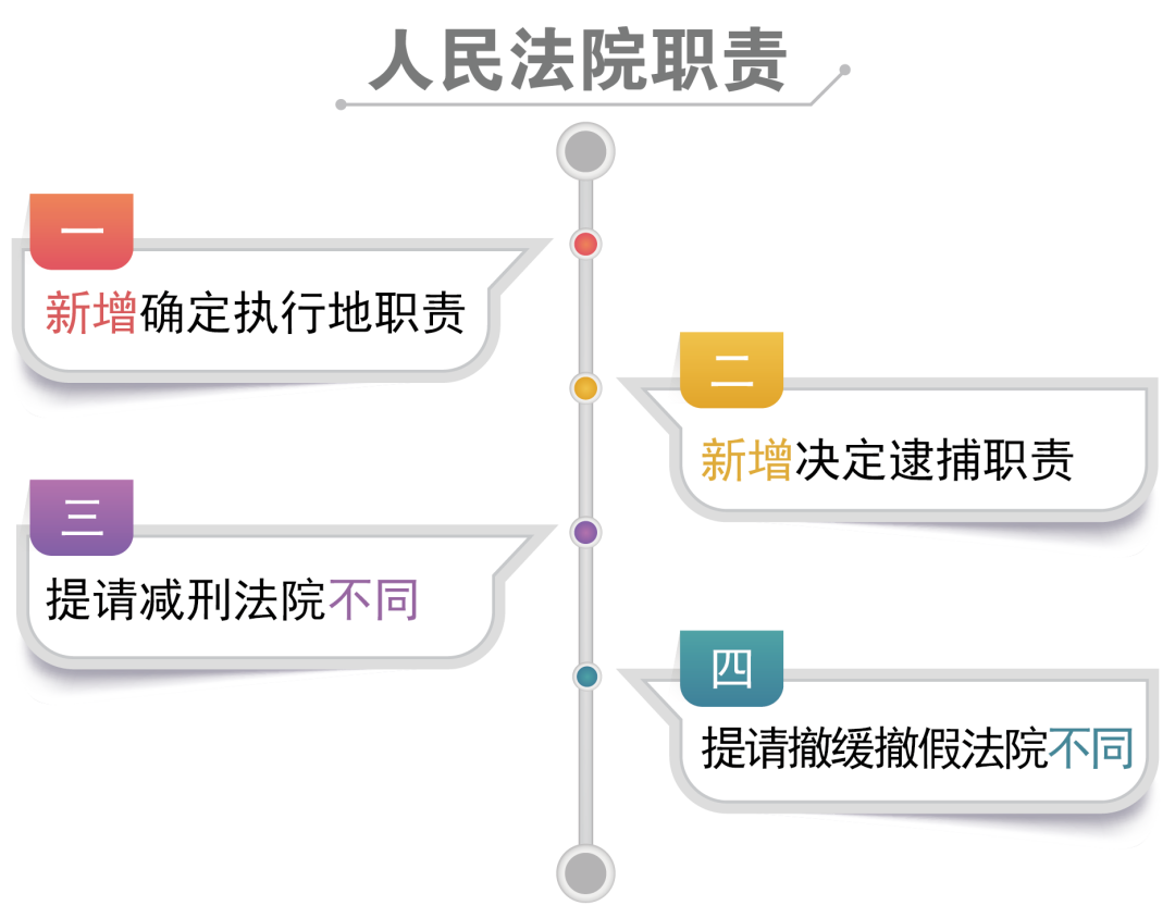 五 人民法院职责 一是新增确定执行地职责。《中华人民共和国社区矫正法》第17条规定:社区矫正决定机关判处管制、宣告缓刑、裁定假释、决定或者批准暂予监外执行时应当确定社区矫正执行地。二是新增决定逮捕职责。《中华人民共和国社区矫正法》第47条规定:被提请撤缓撤假的矫正对象可能逃跑或者可能发生社会危险的,社区矫正机构可以提请人民法院决定对其予以逮捕。三是提请减刑法院不同。《社区矫正实施办法》为居住地中级人民法院;《中华人民共和国社区矫正法》规定为执行地中级以上人民法院。四是提请撤缓撤假法院不同。《社区矫正实施办法》为原裁判人民法院;《中华人民共和国社区矫正法》规定为原审人民法院或者执行地人民法院。