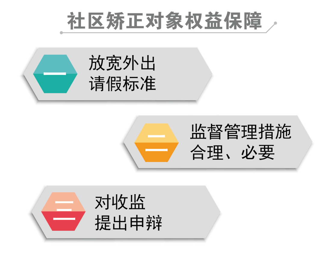 十一 社区矫正对象权益保障 一是放宽外出请假标准。《中华人民共和国社区矫正法》第27条规定:对于因正常工作和生活需要经常性跨市、县活动的,可以根据情况,简化批准程序和方式。二是监督管理措施合理、必要。《中华人民共和国社区矫正法》第34条规定:社区矫正的措施和方法应当避免对社区矫正对象的正常工作和生活造成不必要的影响;三是对收监提出申辩。《中华人民共和国社区矫正法》第48条规定:人民法院拟撤销缓刑、假释的,应当听取社区矫正对象的申辩及其委托的律师的意见。