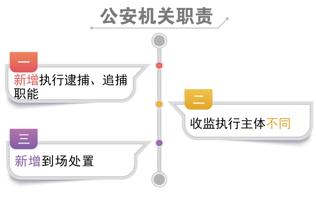 七 公安机关职责 一是新增执行逮捕、追捕职能。《中华人民共和国社区矫正法》第47、50条规定“人民法院决定逮捕的,由公安机关执行”“被裁定撤销缓刑、假释和被决定收监执行的社区矫正对象逃跑的,由公安机关追捕”。二是收监执行主体不同。《社区矫正实施办法》第27条规定:对于撤缓撤假的对象,由司法行政机关负责移交,公安机关予以协助;《中华人民共和国社区矫正法》第48条规定:由公安机关负责移送。三是新增到场处置。《中华人民共和国社区矫正法》第31条规定:社区矫正对象正在实施违反监督管理规定的行为或者违反禁止令等违法行为的,制止无效的,通知公安机关到场处置。