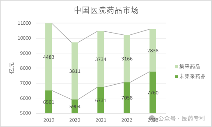 3.打破信息差 便民又公平 为治理零售药店同药不同价现象,自2024年年中,国家医保局下发《关于开展“上网店,查药价,比数据,抓治理”专项行动的函》开始,全国各地就陆续开启行动,上线新系统,借助信息化手段来探索和完善定点零售药店药品的价格管理,加速推进药品比价。 目前来看,先后有北京、天津、河北、山西、内蒙古、辽宁、吉林、黑龙江、上海、江苏、浙江、福建、江西、山东、河南、湖北、湖南、广东、广西、海南、重庆、四川、贵州、云南、西藏、陕西、甘肃、青海、新疆等29个省(自治区、直辖市)以及新疆生产建设兵团陆续推出覆盖全省的定点药店比价小程序。既有利于引导市场合理定价,保障参保群众公平、合理地获得必需药物,也促使零售药店纠正不公平、歧视性高价,促进药品市场公平竞争和良性发展。 4.“取之于民、用之于民” 根据“医药专利”统计,从药品国采执行的2019年到2023年,5年时间内,中国医院药品市场总额从10984降至10598亿元。5年时间医院药费0增长,甚至略有下降。而集采相关药品占比却逐年下降,从40.8%降至26.8%,下降了14%,集采药品使用金额绝对值下降了1645亿元。在药费总支出不变的情况下,成功实施了腾笼换鸟。 中国医院市场药品销售(亿元)