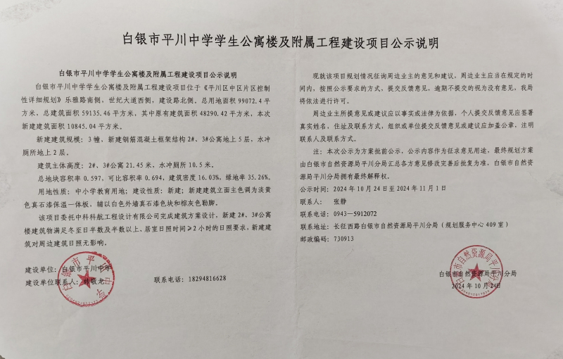 白银市平川中学学生公寓楼及附属工程建设项目公示说明 白银市平川中学学生公寓楼及附属工程建设项目位于《平川区中区片区控制性详细规划》乐雅路南侧,世纪大道西侧,建设路北侧。总用地面积99072.4平方米,总建筑面积59135.46平方米,其中原有建筑面积48290.42平方米,本次新建建筑面积10845.04平方米。 新建建筑规模:3幢,新建钢筋混凝土框架结构2#、3#公寓地上5层,水冲厕所地上2层。 建筑主体高度:2#、3#公寓21.45米,水冲厕所10.5米。 总地块容积率0.597,可比容积率0.694,建筑密度16.03%,绿地率35.26%。 用地性质:中小学教育用地;建设性质:新建;新建建筑立面主色调为淡黄色真石漆保温一体板,辅以白色外墙真石漆色块和棕灰色勒脚。 该项目委托中科科航工程设计有限公司完成建筑方案设计,新建2#、3#公寓楼建筑物满足冬至日半数及半数以上、居室日照时间≥2小时的日照要求,新建建筑对周边建筑日照无影响。 建设单位:白银市平川中学 现就该项目规划情况征询周边业主的意见和建议,周边业主应当在规定的时间内,按照公示要求的方式,提交反馈意见,逾期不提交的视为没有意见,我局将依法进行许可。 周边业主所提意见或建议应以事实或法律为依据,个人提交反馈意见应签署真实姓名,住址及联系方式,组织或单位提交反馈意见或建议应加盖公章,注明联系人及联系方式。 注:本次公示为方案批前公示,公示内容作为征求意见用途,最终规划方案由白银市自然资源局平川分局汇总各方意见修改完善后批复为准,白银市自然资源局平川分局拥有最终解释权。 公示时间:2024年10月24日至2024年11月1日 联系人: 张静 联系电话:0943—5912072 联系地址:长征西路白银市自然资源局平川分局(规划服务中心409室) 邮政编码:730913