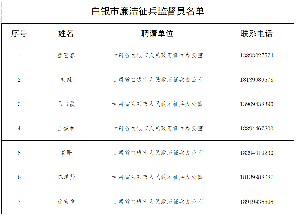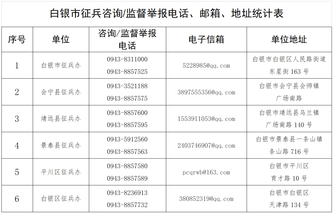 依法服兵役和进行兵役登记是每名适龄公民应尽的光荣义务和神圣职责,白银市2026年兵役登记和征兵报名已全面展开,现公告相关事项并公开信访举报渠道:2026年12月31日前年满18周岁(即2008年1月1日至12月31日出生)的男性公民,应当依法履行兵役登记义务。进行兵役登记时可同时进行2026年义务兵应征报名,如无参军入伍意愿,兵役登记时可选择“只进行兵役登记”。未超过24周岁(截至2026年12月31日前)的男性公民,未经过兵役登记的,均应进行补登;往年已进行兵役登记的,应登录“全国征兵网”对个人信息进行核验。女青年不需要进行兵役登记。1.填写信息。有三种方式:第一种是关注并进入微信公众号“甘肃征兵”,点击下方“应征报名”进入“兵役登记”;第二种是登录“全国征兵网”(网址:http://www.gfbzb.gov.cn)点击右侧“兵役登记(男兵)”,按要求真实、完整填写基本信息;第三种是到乡镇(街道)、学校武装部设立的固定兵役登记站进行现场登记提醒:通过线上途径进行兵役登记时,要求使用学信网账号登录;如无学信网账号,可在“兵役登记”界面点击“注册”选项自行注册。2.打印表格。信息填写完整后,打印或下载《男性公民兵役登记表》。3.审核确认。县级兵役机关负责对公民“应服兵役、免服兵役或者不得服兵役”3种情形进行审核确定,向公安机关核查公民被判处刑罚情况,向人力资源社会保障部门、残疾人联合会核查公民伤残鉴定和残疾评定等情况,作出审核结论并在公民初次兵役登记表中予以注明。4.领取《兵役登记证》。县级兵役机关为完成初次兵役登记的公民出具电子兵役登记凭证;确有需要的,也可以出具纸质兵役登记凭证。电子兵役登记凭证和纸质兵役登记凭证具有同等效力。男兵:上半年报名时间为2025年12月6日至2026年2月10日24时;下半年报名时间为2025年12月6日至2026年8月10日24时。女兵:上半年报名时间为2026年1月1日至2026年2月10日24时;下半年报名时间为2026年7月1日至2026年8月10日24时。男兵:高中(含中专、职高、技校)毕业生及以上文化程度的青年(含高校在校生),年满18至22周岁(2004年1月1日至2008年12月31日出生);普通高等学校本专科毕业生、上半年符合毕业条件的毕业班学生,放宽至24周岁;研究生毕业生及在校生放宽至26周岁;初中毕业文化程度男青年,年满18至20周岁。女兵:普通高等学校和科研机构全日制应届毕业生及在校生,年满18至22周岁(2004年1月1日至2008年12月31日出生),全日制研究生应届毕业生及在校生放宽至26周岁;2025年普通高等学校全日制本专科应届毕业生可以报名参加2026年上半年女兵征集,年龄放宽至23周岁。1.登录全国征兵网(http://www.gfbzb.gov.cn/),点击“应征报名(男兵)/(女兵)”,男兵在应征报名之前,要先完成兵役登记。2.进入“应征报名(男兵)/(女兵)”页面后,会告知报名时间及参军政策说明,认真阅读后点击“进行应征报名”。3.注册学信网账号,进行登录,有学信网账号的可直接登录。2.点击菜单栏“应征报名”选择“男兵报名”/“女兵报名”,直通全国征兵网报名页面。3.在“应征报名(男兵)/(女兵)”网页点击“进行应征报名”。(1)家庭优待金:义务兵服役期间,按上年度全省城镇居民人均消费支出(2024年甘肃省为28013元)95%发放,共发放两年。义务兵家属按照规定享受军属优待。(2)高原服役奖励金:志愿到高原地区服役的,一次性发放10000元奖励金,并增发30%义务兵家庭优待金。(3)部队生活待遇。义务兵期间享受津贴和补贴。现行标准,第一年每月1100元,第二年每月1150元(不含骨干、特殊岗位津贴,艰苦边远地区、防暑降温费等补贴)。(4)退役补助金:选择自主就业的退役士兵在退役后发放一次性经济补助金,标准为退役时上年度全省城镇居民人均消费支出的100%。(5)一次性退役金。符合相关条件的自主就业退役士兵,按照国家和军队有关规定,领取一次性退役金。现行基本标准为服现役每满一年,发给4500元。获得荣誉称号或者立功的退役士兵,以基本标准为基数,按照一定比例增发退役金。2.大学生(在享受高中毕业生政策基础上,还享受如下政策)(1)国家教育资助。按照本专科生每人每年最高不超过20000元、研究生每人每年最高不超过25000元标准(缴纳学费达不到标准的,按实际缴纳数额计)享受学费补偿、国家助学贷款代偿、学费减免。(2)一次性奖励金。大学生入伍由政府发放一次性奖励金,现行标准:本科以上毕业生10000元、专科毕业生7000元;在校生(含新生)本科7000元、专科5000元。(1)报考军士院校。现役士兵符合条件的可报考军士学校,毕业后取得大专学历,并授予相应军士军衔。(2)选改军士。义务兵服役期满,经本人申请并符合相关条件的,可选改军士,授予相应军士军衔。义务兵服役期间表现特别优秀的,经批准可以提前选改为军士。二次入伍服现役满1年,可提前参加军士选改。(1)报考军校。对象为普通高中毕业以上文化程度或同等学历人员,未婚,年龄不超过22周岁(入伍前是普通高等学校在校生、毕业生或者是少数民族的,可放宽1岁),服现役满1年,不超过3年,符合部队相关条件,可报考军校。(2)本科毕业生提干。对象为普通高校全日制本科以上毕业,服役满1年、不超过3年,本科毕业生年龄不超过26周岁,研究生毕业生不超过29周岁,符合部队相关条件,可以提干。其中在驻西藏和三类以上艰苦边远地区少数民族聚居区部队服
