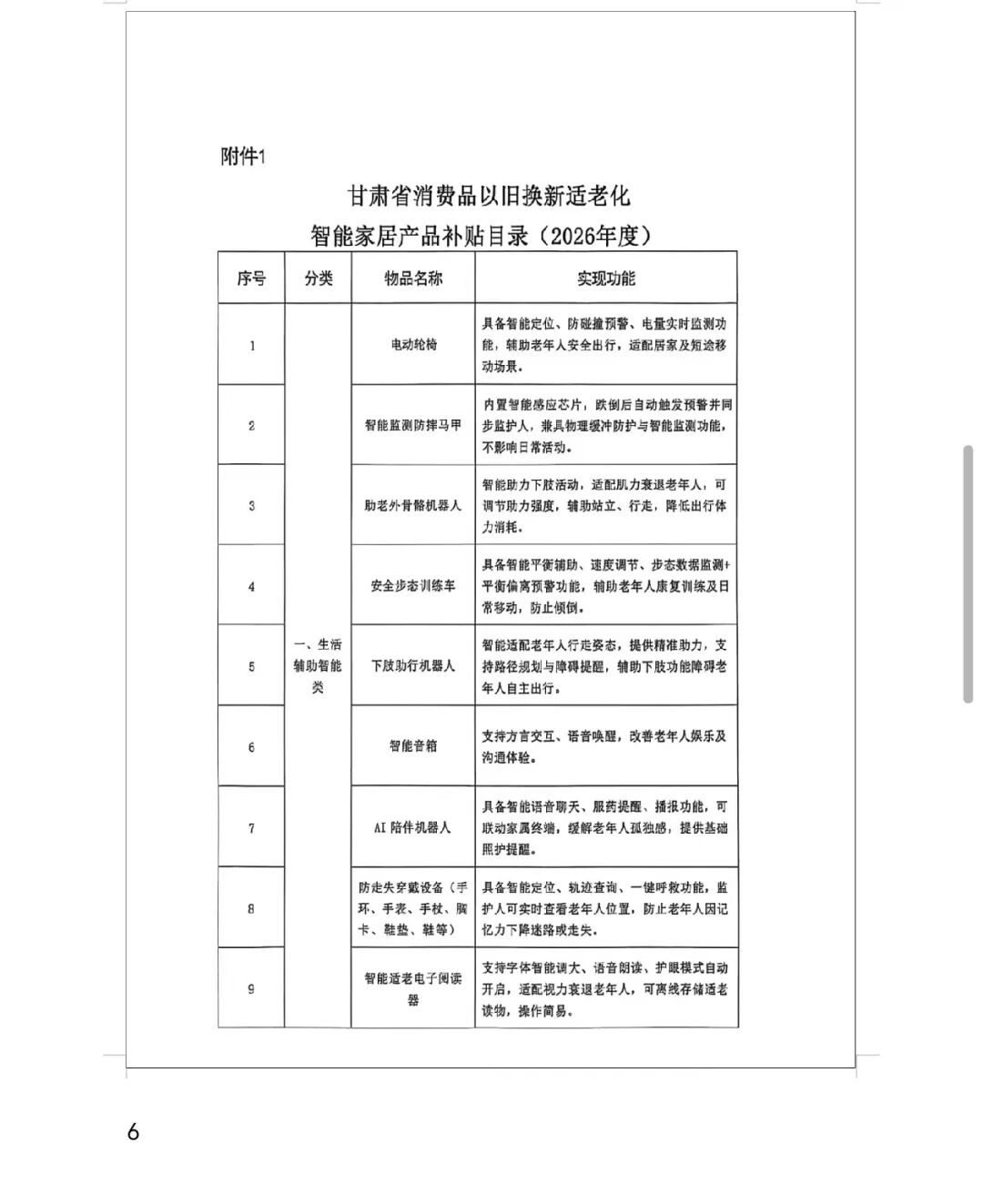 平川区民政局关于开展2026年度消费品以旧换新适老化智能家居补贴的公告根据《甘肃省2026年度消费品以旧换新适老化智能家居补贴实施方案》(甘民发〔2026〕16号)要求,为切实做好2026年度消费品以旧换新适老化智能家居补贴工作,提升老年人居家生活的安全性、便利性和舒适度,现将相关事项公告如下: 一、补贴对象 常住平川区有居家适老化改造需求的60周岁及以上老年人家庭。不以房屋归属及房屋是否初装为限制性因素。 二、补贴原则 1.需求导向,突出重点。聚焦老年人居家养老需求,优先考虑高龄、失能老年人家庭。 2.自愿申请,公平普惠。尊重老年人及其家庭意愿,符合条件者可自愿申请。 3.一户一补,限额补贴。以老年人家庭为单位,每户在本公告有效期内享受一次补贴,总额控制。 4.先报先补,预算约束。根据补贴申报先后顺序进行补贴,补贴资金用完为止。 三、补贴范围 补贴范围以《甘肃省消费品以旧换新适老化智能家居产品补贴目录(2026年度)》(附件1)为准,该目录主要涵盖生活辅助智能类、监测预警智能类、环境适配智能类及健康管理与照护智能类产品。 超出目录范围的物品和材料购置费、居家适老化改造的装修费和人工费等不予补贴。 四、补贴标准 在合理的需求范围内购置指导目录内的适老智能家居产品,补贴标准应不高于实际销售价格(剔除所有折扣和优惠后的价格)的30%,每户补贴总金额不超过2万元。 五、补贴时限 自本公告发布之日起至2026年12月31日结束,对在此期间内购置适老智能家居产品予以补贴。但因补贴资金支付进度快,提前发放完毕,将另行公告终止补贴工作。 六、备案申请所需资料 1..居家适老化智能家居改造所用物品和材料购置需求表(需求表需在“甘快办”自行下载,填报完毕后上传本人签字件,申请表的信息必须填写完整,家庭住址具体到门牌号,联系电话必须常用并畅通)。 2..身份证(申请人本人及家庭其他老年人身份证正反面照片)。 3.户口簿(户口簿首页、申请人本人页及在同一家庭户申请的60周岁以上老年人户口页照片)。 4.拟改造房屋结构图(房产证结构图、房屋户型图或手绘图纸等)。 七、备案成功后购改申报所需资料 1.申请人本人务必详细完整填写银行卡账号、开户行全称、开户银行行号(可拨打银行客服电话查询),其中出现一项信息填写错误,资金将无法支付。 2.支付凭证(包括刷卡小票、付款截图等,现金支付的需要加盖商家印章的收款收据),支付凭证收款方名称必须和供货商发票开具的单位名称相一致(不一致的请提供情况说明加盖商家印章)。 3.购置发票(发票需为正规发票,发票上应有申请老年人姓名、身份证号码、物品名称、规格型号、数量、价格等信息填写完整且二维码、发票号码不要遮挡,以便入户人员核实购买物品与发票的一致性;购买物品需严格按照《甘肃省消费品以旧换新适老化智能家居产品补贴目录(2026年度)》(附件1)要求)。 4.购置物品、材料照片(照片要能显示购置物品及材料的产品名称、品牌、功能等信息),所有照片均需以水印照片上传,显示时间及所在地点,老人同框。 5..居家适老化改造前和改造后照片(安装类),以具有明显参照物照片(照片用水印相机拍摄,改造前后在同一角度拍照)上传,显示时间及所在地点,老人同框。 6.《申报补贴承诺书》(附件3)(申请人签字后上传)。 八、补贴流程 补贴申请原则上通过“甘快办”(APP或微信、支付宝小程序)线上办理;对于不便操作智能设备且家庭成员无法提供有效帮助的老年人,乡镇人民政府(街道办事处)、村(社区)工作人员将提供必要协助。具体流程如下: 1.申请备案。申请人通过“甘快办”上传《甘肃省适老智能家居产品购置需求表》(附件2)、老年人身份证、户口簿、房屋结构图或场景照片等材料,乡镇人民政府(街道办事处)对是否符合补贴条件及其需求合理性进行审核,3个工作日内出具意见,对需求符合实际的报区民政局,不符合实际的予以驳回,并说明原因;区民政局根据资金实际,原则上2个工作日内出具备案意见(对因资金暂时用完的,可以延期出具意见),确保补贴资金使用精准、高效。 申请人必须备案通过之后才能购买智能家居产品,支付凭证和发票(必须显示规格型号)的时间必须在备案通过时间之后,提前购买改造的一律不予补贴。 2.购改申报。老年人家庭备案成功后20日内(超出期限备案资格失效、备案金额回收),自主选择销售信誉好、质量有保证、价格可承受的供货商购置安装产品,并索要支付凭证及发票,对购置物品进行拍照(显示时间、地点、人物同框),购置安装完成后通过“甘快办”补充提交支付凭证和发票、照片(显示时间、地点、人物同框,购买智能化物品需同步上传物品说明书或物品自带标识)、申报补贴承诺书(附件3)、申请人确定的银行账户及开户行相关信息,申报补贴。 购买助听器的必须要用水印相机拍老人与物品同框正面照和佩戴照片,照片务必清晰。3. 审核拨付。乡镇人民政府(街道办事处)收到申请件后会同村(社区)对老年人家庭信息、发票和支付凭证、实际购买情况等进行现场核查,10个工作日内出具审核意见(附验收表与验收照片)后报区民政部门。区民政部门对申请内容进行复核,5个工作日内出具审批意见。对符 合补贴条件的,会同财政部门及时将补贴资金拨付至申请人确定的银行账