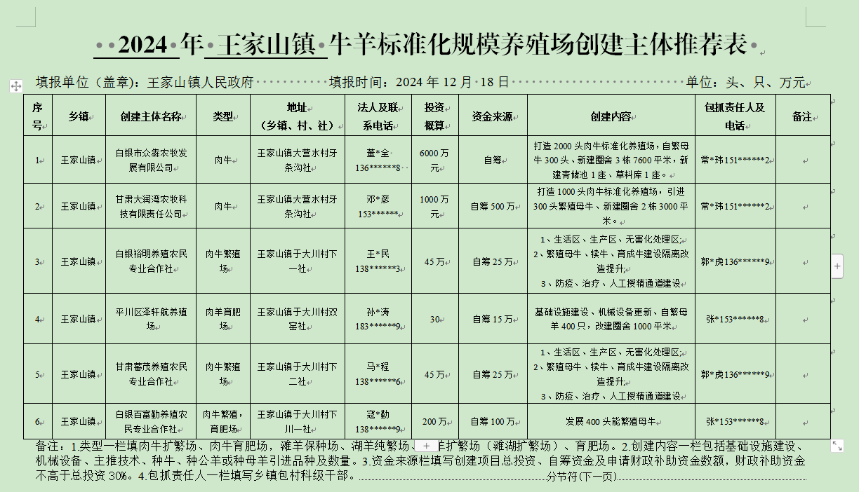 2024 年 王家山镇 牛羊标准化规模养殖场创建主体推荐表