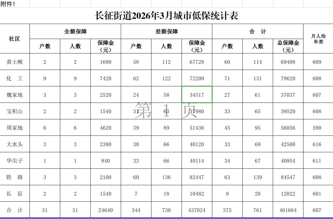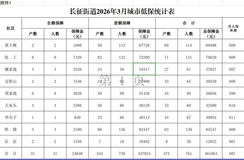 平川区长征街道2026年3月份城市低保汇总表